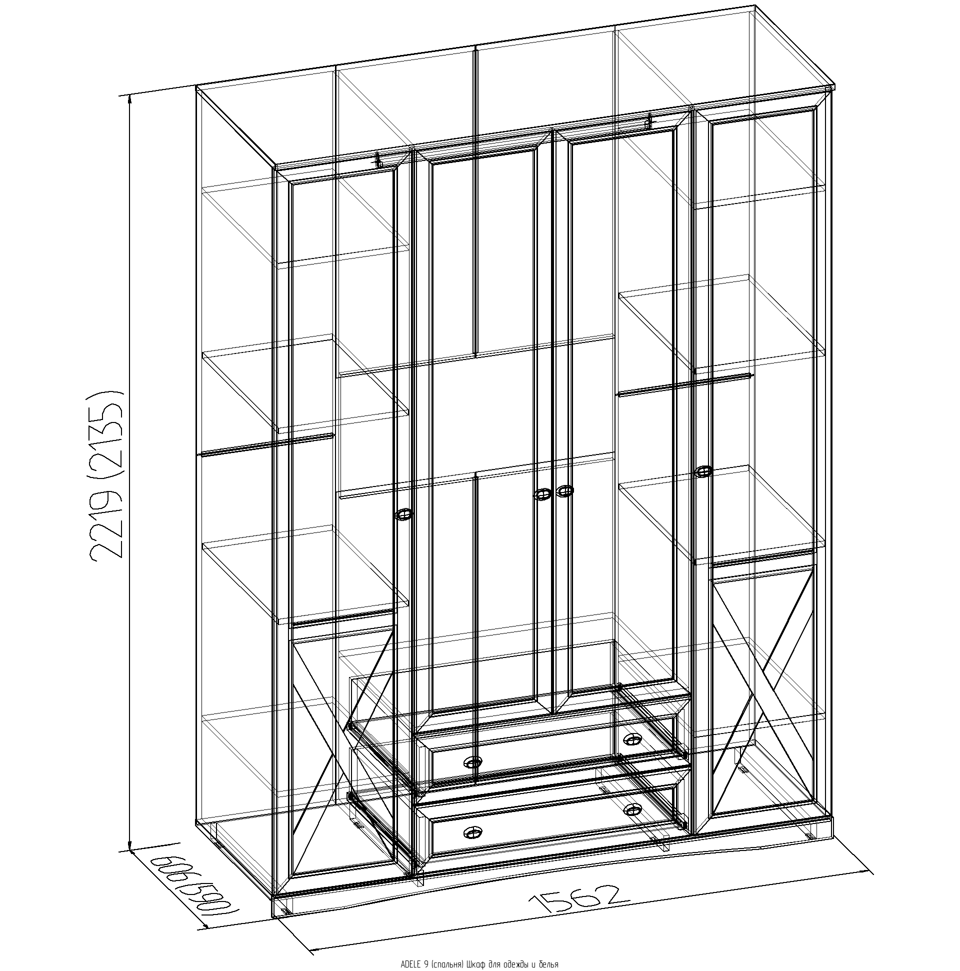 Вместительные шкафы позволят разместить в спальне весь Ваш гардероб. ADELE 9 Шкаф для одежды и белья выигрышно смотрится с карнизом, который придает шкафу изюминку и подчеркивает выбранный стиль Прованс, но и без него, с декоративной раскладкой на дверцах, выглядит тоже прекрасно.