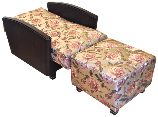 Современная стильная модель. Съемный чехол на спальном месте. Сиденье и спинка сформированы на основе металлокаркаса с деревянными латами, на котором закреплен мягкий мат, состоящий из пружинного блока с настилом из термовойлока и листового пенополиуретана. При помощи трехпозиционного замка трансформации спинка принимает три положения: сидя, полулежа, лежа. В коробчатом основании кресла расположена емкость для хранения спальных принадлежностей. Кресло оснащено декорированными гнутыми подлокотниками.Для трансформации требуется расстояния между стеной и спинкой кресла. При раскладке кресла совместно с пуфом- образуется полноценное спальное место. Подлокотники съемные. Механизм раскладки "клик- кляк".