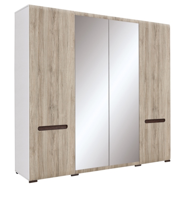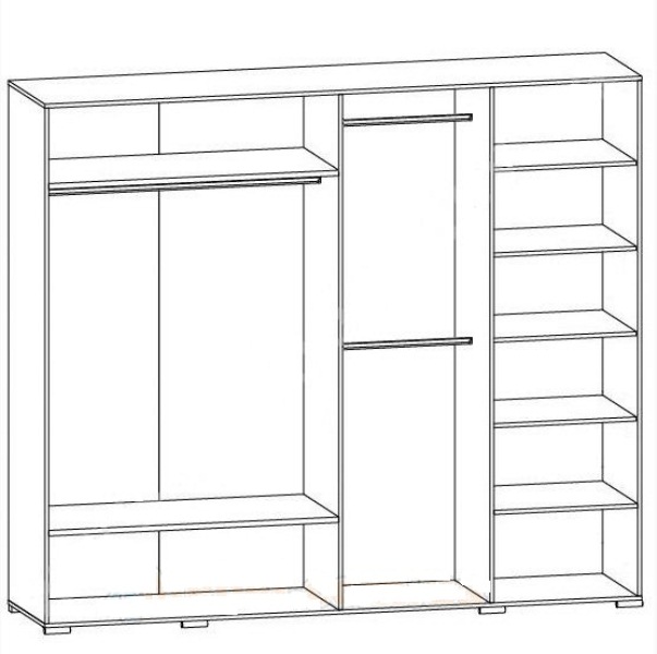 4 распашные глухие двери, за которыми расположены 2 штанги стационарных металлических для одежды, в нижней части расположена 1 ниша и 4 выдвижных ящика на роликовых направляющих, и 5 полок из ДСП;