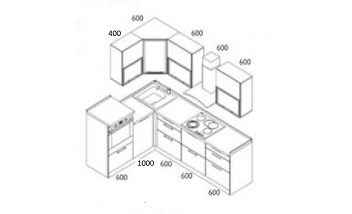 Глубина кухни по корпусу: низ – 450 мм+фасад (466мм), верх – 300 мм+ фасад (316 мм).