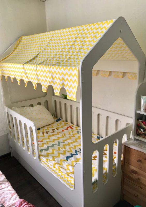 Под заказ можно дополнить домик кроватку аксессуарами: балдахин на крышу, комплект постельного белья, комплект шторы (2 шторы + 2 завязки)