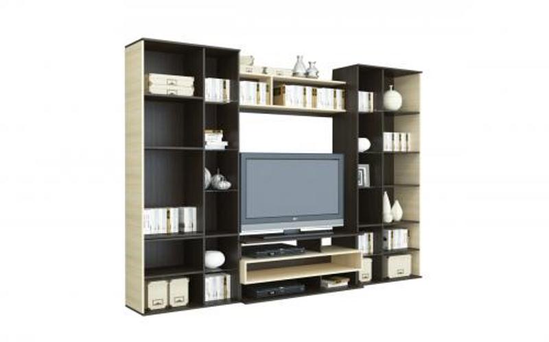 Гостиная САПФИР выполнена в стиле хайтек, удобные пеналы, стеклянные полки для посуды и парящая ТВ тумба с двумя ящиками. Возможно добавить платяной шкаф. Цвет гостиной : Дуб Кантербери- Дуб Сонома, Венге - Белый.