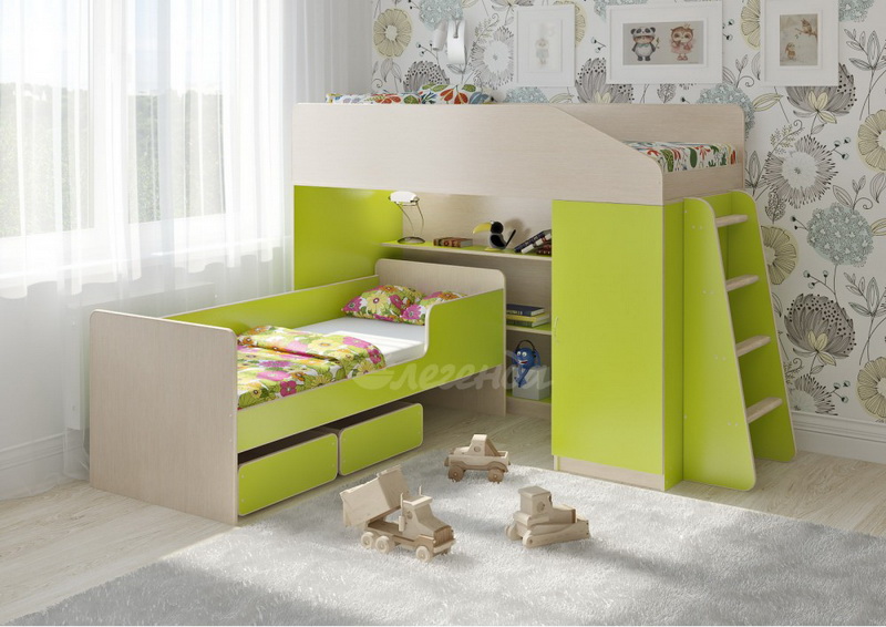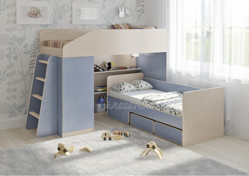 Под верхним спальным местом располагается стеллаж,состоящий из трех полок. Вместительный шкаф с четырьмя полками и штангой для хранения одежды,белья,игрушек или иных вещей.