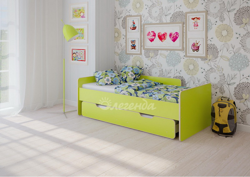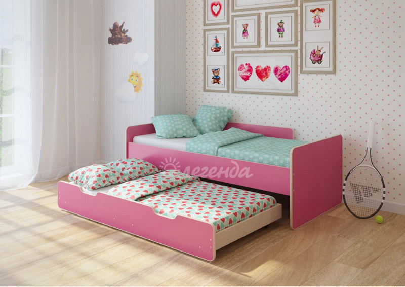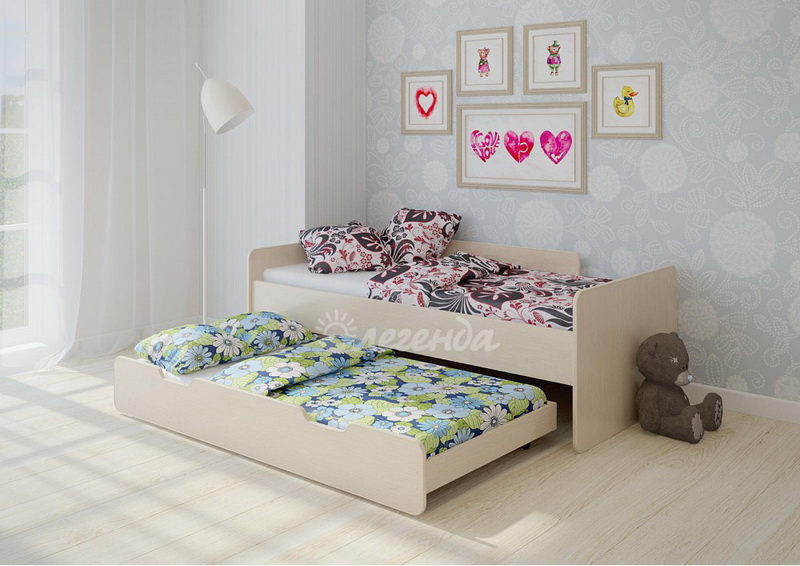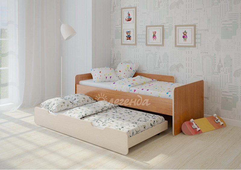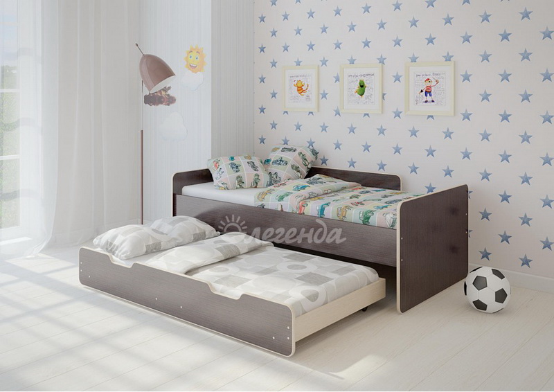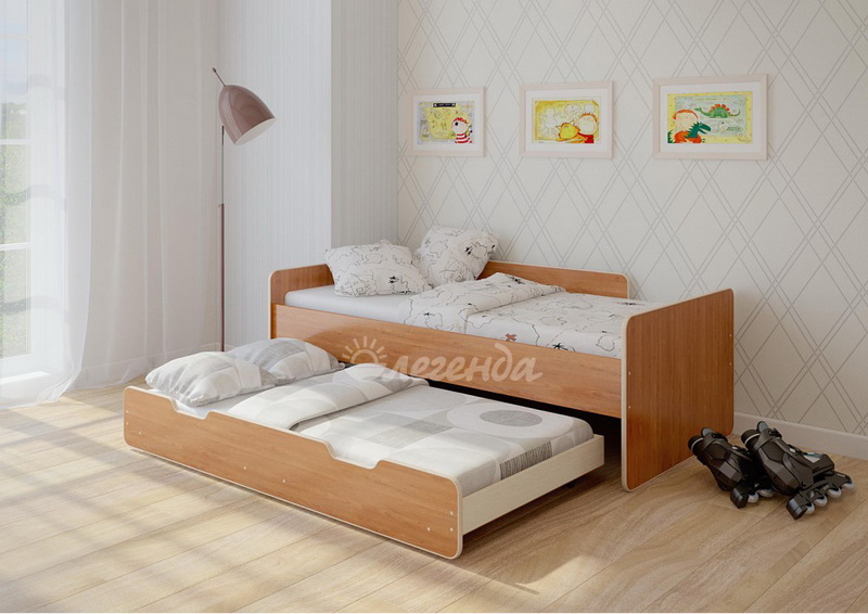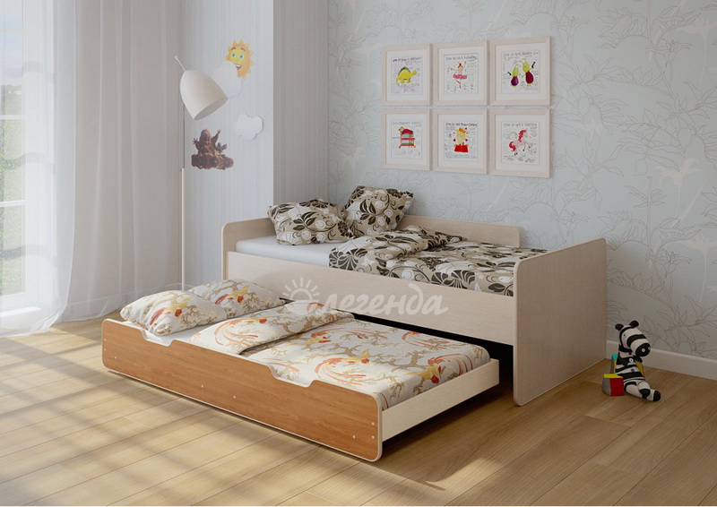 Замечательный вариант кровати для двоих детей. Выдвижной ярус представлен большим выкатным ящиком, который спроектирован таким образом, что может быть использован и как ящик для хранения вещей, и как отдельное спальное место.