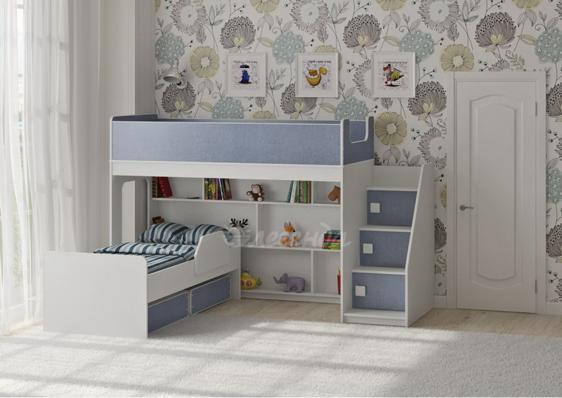 Двухъярусная кровать двумя перпендикулярными спальными местами - 1750х750 и 1600х700 ммВысота кровати – всего 1405 мм. Удобно - взрослый может заправить кровать, не забираясь на второй ярус.