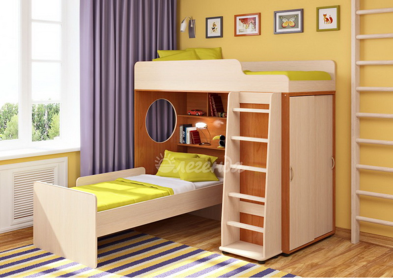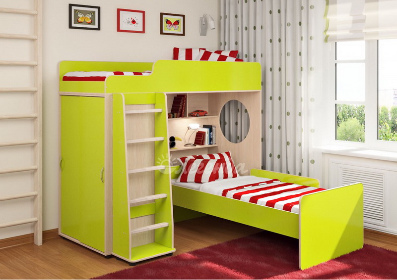 Под верхним спальным местом в игровой зоне располагается стеллаж,отлично подходящий для хранения игрушек.Стеллаж состоит из трех полок, разделенных на две секции – удобно для поддержания порядка и сортировки предметов.