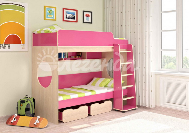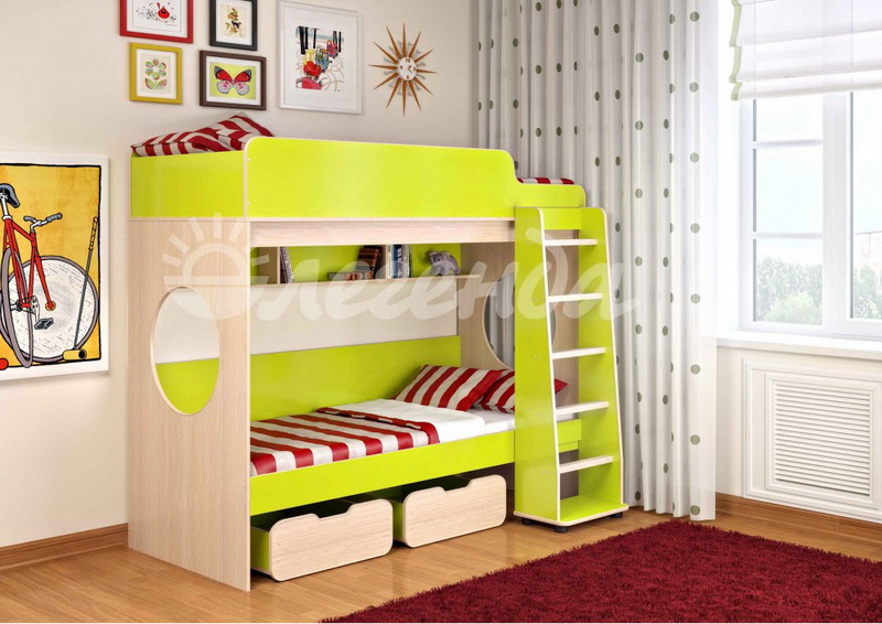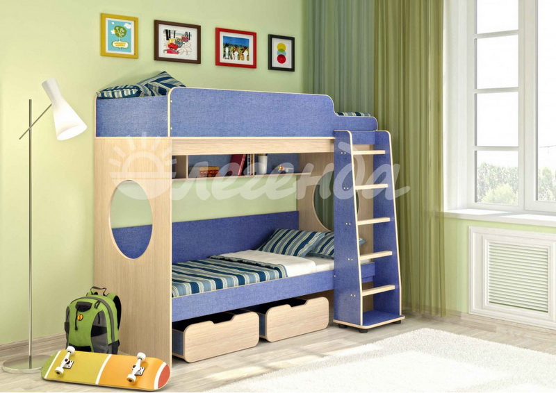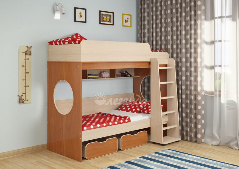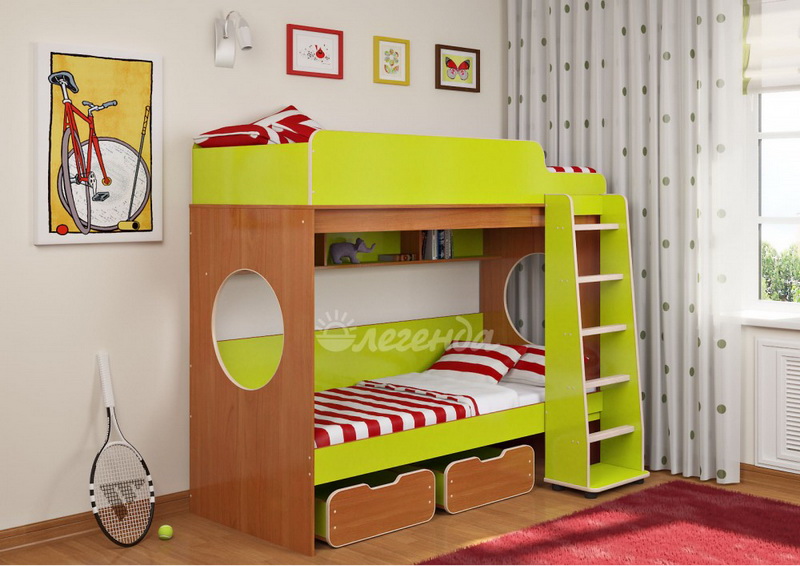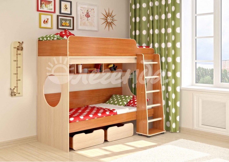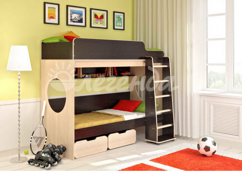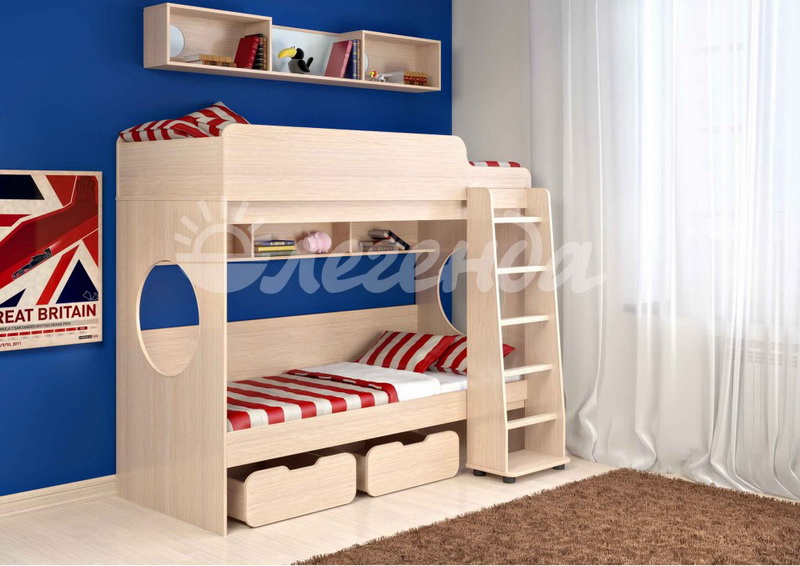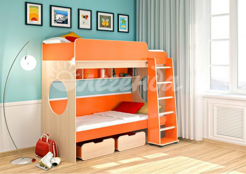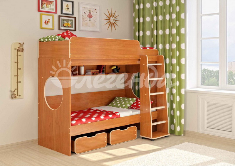 Над нижним спальным местом располагается встроенная трёхсекционная полка,в которой удобно хранить книги,учебники,тетради,канцелярию и другие нужные вещи.