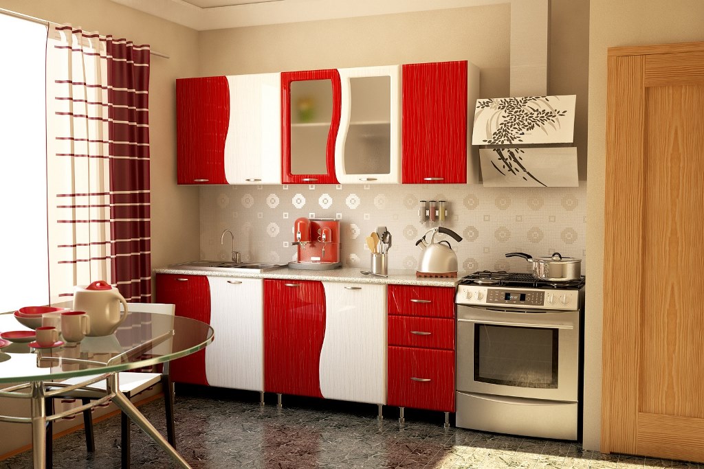 Кухонный гарнитур Волна (МДФ красный+белый дождь)