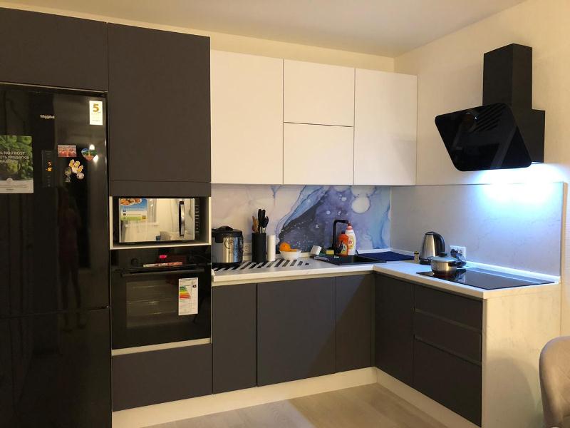 Цвет корпуса, фасада, столешницы, стекла, ручки могут быть практически любыми, цена при этом не поменяется. Кухня может быть оснащена доводчиками (Blum, Boyard).