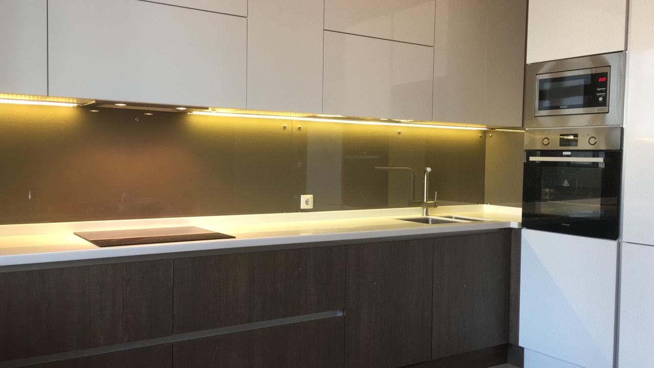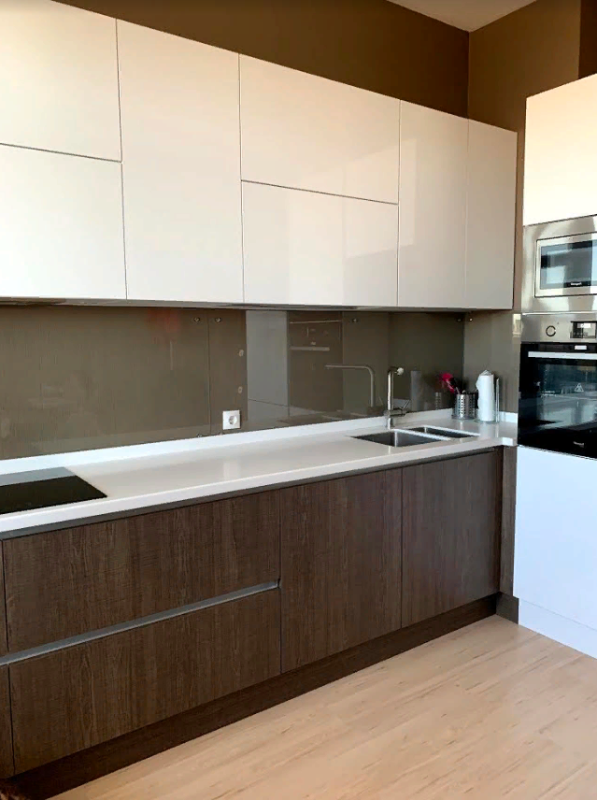 К кухне можно заказать фартук (мебельный щит) ХДФ с фотопечатью, стекло с фотопечатью либо фартук в цвет столешницы.