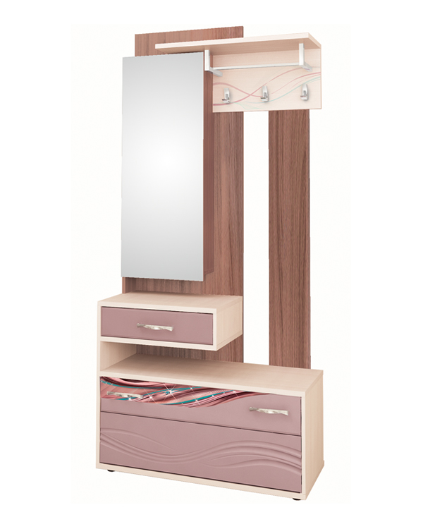 Ширина прихожей всего 1000 мм, но при этом на ней можно разместить: верхнюю одежду – на панели с крючками, головные уборы – на открытой полке, обувь – в закрытой тумбе, различные мелочи – на полках за зеркалом и в ящике. «Лаура 38.06»  входит в набор мебели для прихожей «Лаура».
