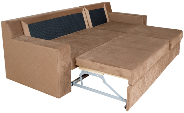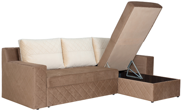 Современный стильный диван. Возможно использовать как центральный объект интерьера. Для трансформации не требуется расстояние между стеной и диваном. В основании короба оттоманки имеется емкость для постельных принадлежностей. Спальное место на основе пружины- змейки, термовойлока и высокоэластичного ППУ. Выкатная часть изготавливается в основной ткани. Декоративная отстрочка на приспинных подушках и элементах дивана. Механизм раскладки «Дельфин»