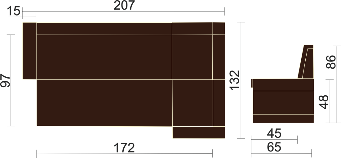 • Модель без спального места, с выкатным ящиком. Вместо трансформирующейся в спальное место секции может быть установлен выкатной ящик.
