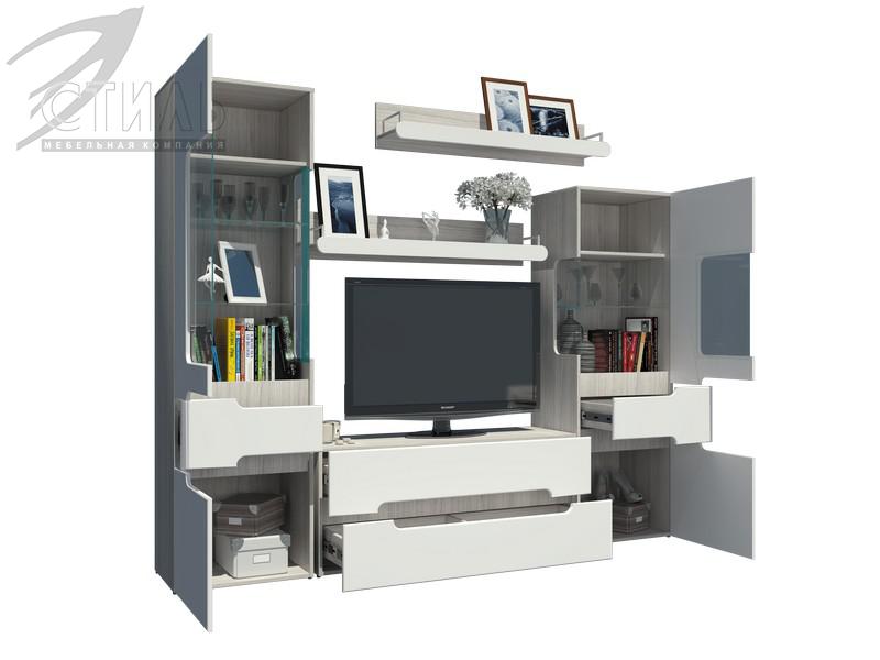 В данной гостиной модули могут располагаться отдельно друг от друга и место под TV строго не регламентируется. На стандартной композиции место под TV Д1200хВ764 мм.