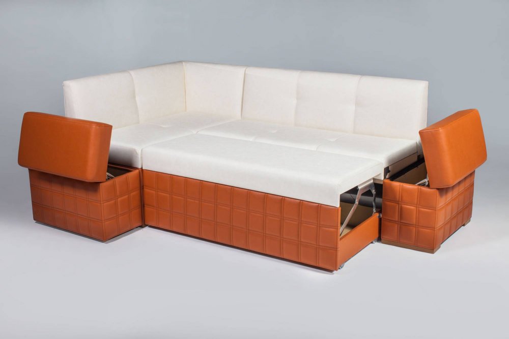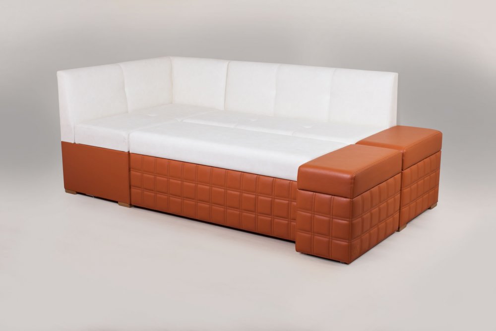 • Конструктивные. Возможны разные варианты исполнения подлокотников: 1) оба широкие, 2) оба узкие, 3) один широкий, один узкий. Отдельно можно заказать приставной пуф, равный по размеру широкому подлокотнику, для увеличения спального места.