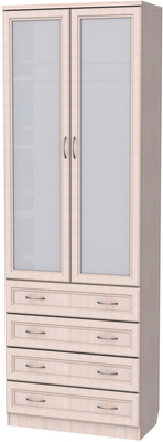 Нижняя часть шкафа оснащена четырьмя выдвижными ящичками. Аналогично, как и полки, ящики одинаковы по площади и высоте. В ящиках очень удобно хранить разнообразные мелочи, которые всегда нужны под рукой, а если шкаф будет установлен в спальной комнате, то в ящичках можно хранить постельное белье или одежду. Благодаря качественным современным механизмам, ящички легко скользят и открываются. Весь шкаф декорирован фурнитурой, воссоздающей классический стиль мебели, именно благодаря этому шкаф и будет прекрасным дополнением в любой комнате. Особенно выгодно использовать шкаф в комнате небольшого размера, поскольку, несмотря на свою вместительность, шкаф обладает действительно компактными размерами. Большой объем обеспечивается длинной и высотой шкафа.