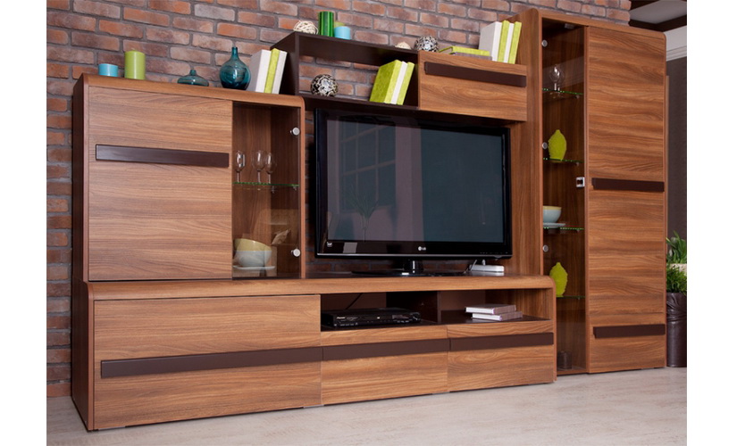 Модульная гостиная «София» - выполнена в минималистском дизайне с использованием выразительной древесной текстуры декора, чем и привлекает к себе внимание. Стеклянные полки подсвечиваются. Другой особенностью серии «София» являются ручки, изготовленные из МДФ  и спроектированные на всю ширину фасадов.