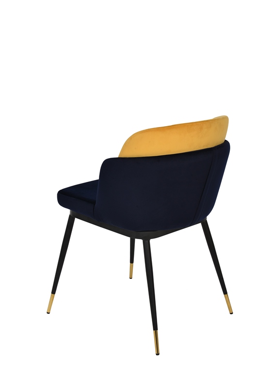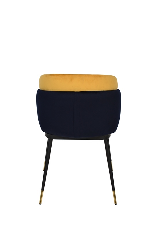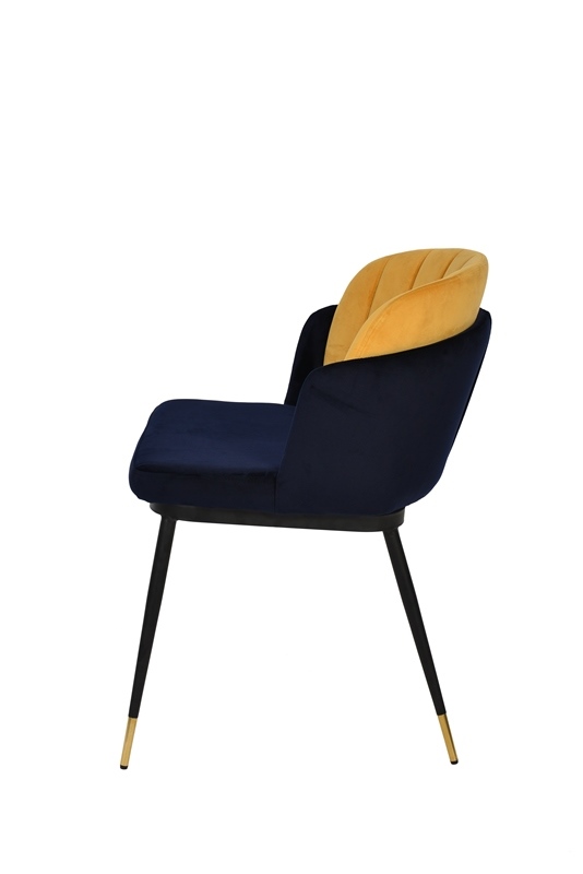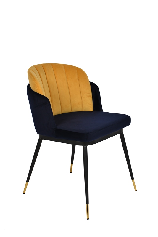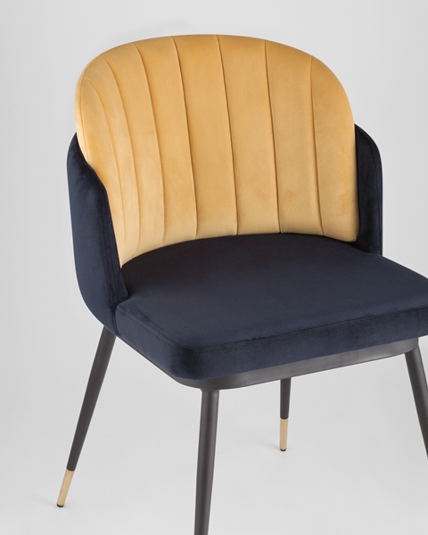 Мягкий двухцветный стул с обивкой из вельвета. Надежная опора достигается благодаря металлическому каркасу и удобным устойчивым ножкам, украшенным золотом. Спинка состоит из двух элементов, внутренняя часть с красивой вертикальной строчкой.
