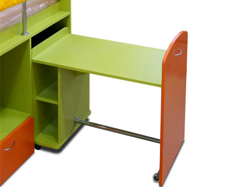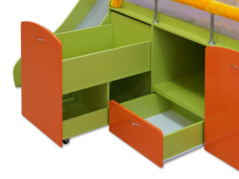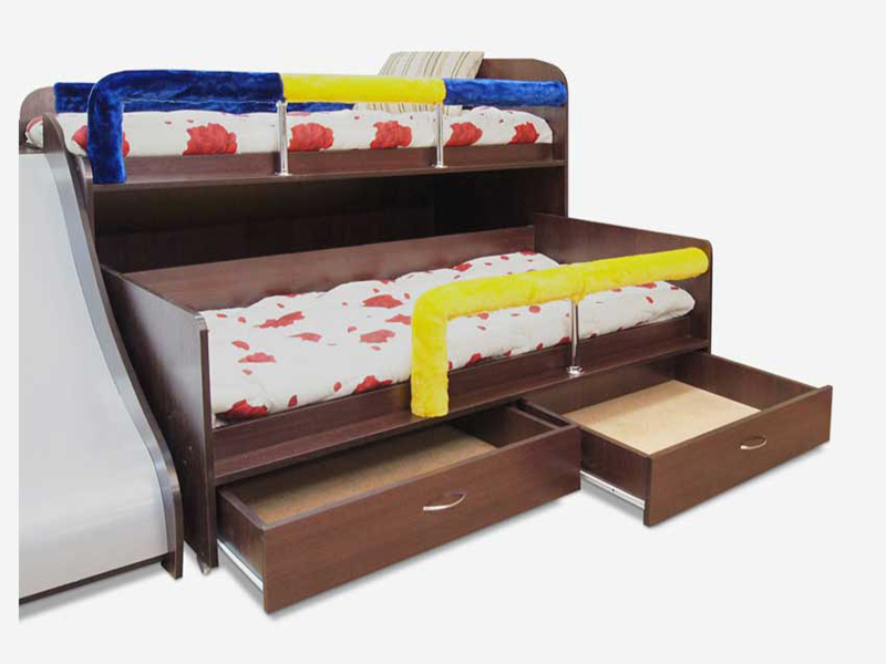 Эта модель придется по нраву маленьким непоседам: все её модули отлично подходят для веселых игр, а маленькая горка с безопасным пластиковым покрытием только добавит радости юным искателям приключений. Модель может быть скомплектована в вариантах «кровать плюс выкатной столик» (который можно поставить в любой точке комнаты) или «две кровати» (нижняя выкатывается в сторону, обеспечивая простор ребенку).