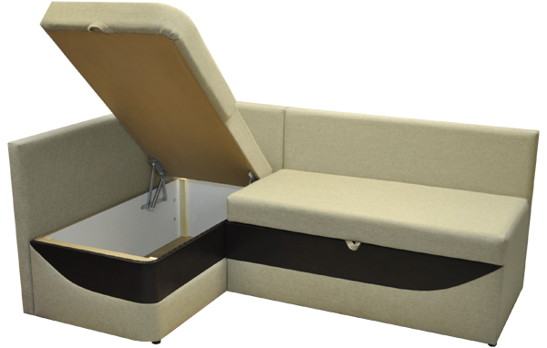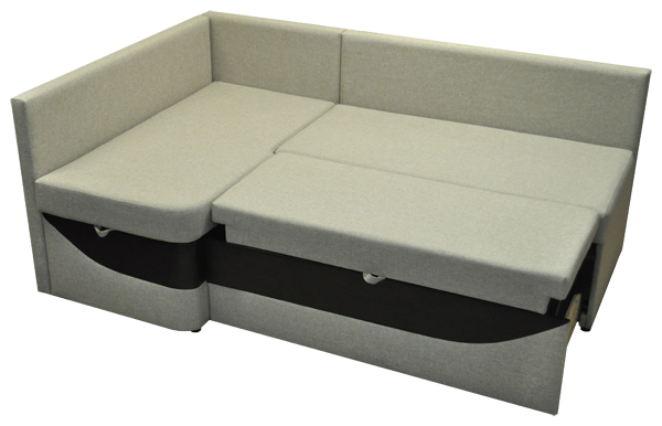 Кухонный уголок. Ровное спальное место, оснащенное механизмом трансформации "Дельфин". В основании дивана рамка с латами, на которые уложены мат из высокоэластичного ППУ. При трансформации, диван находится вплотную к стене, раскладка производится в переднем направлении.  В коробчатом основании оттоманки расположена емкость для хранения. Диван комплектуется съемными приспинными подушками.